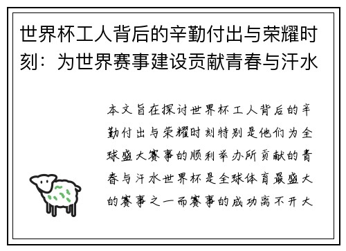 世界杯工人背后的辛勤付出与荣耀时刻:为世界赛事建设贡献青春与汗水